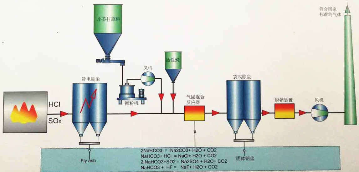 此工艺直接将碳酸氢钠细分直接喷入高温烟气,在高温下碳酸氢钠分解成碳酸钠Na2CO3,水(H2O)和二氧化碳(CO2,新产生的碳酸钠在生成瞬间有高度的反应活性,可自发的与烟气中的酸性物质进行反应